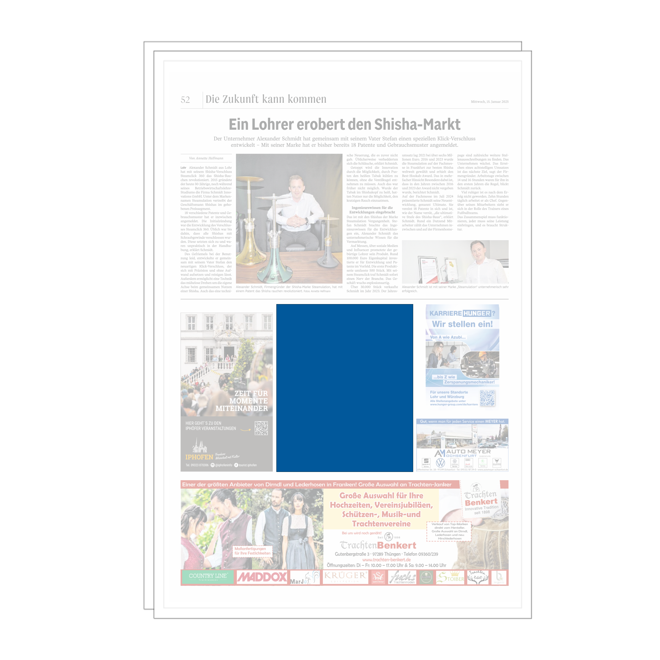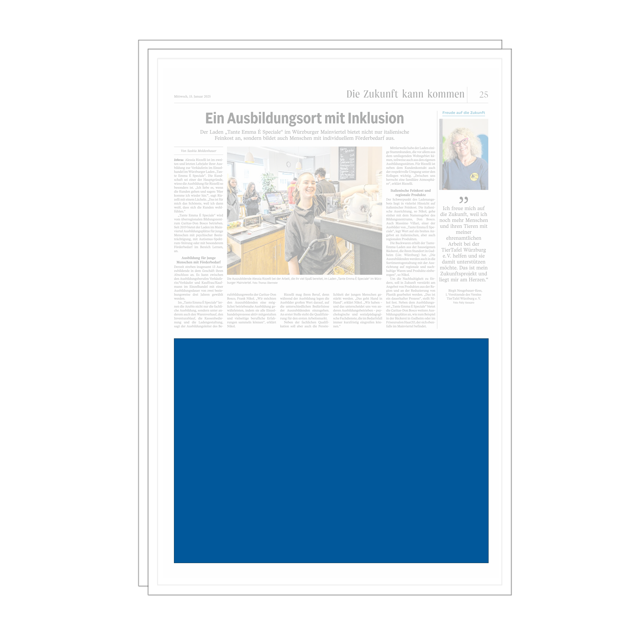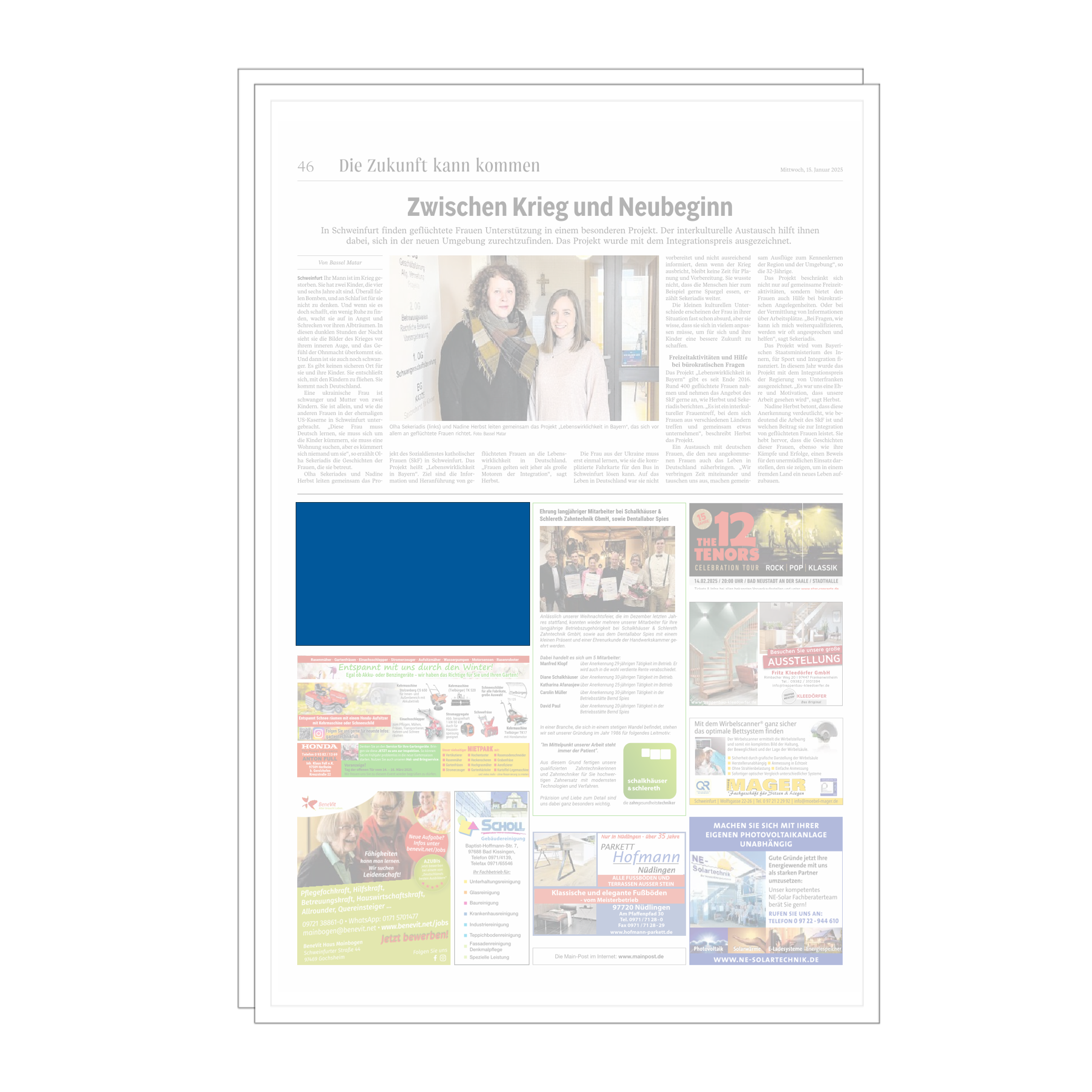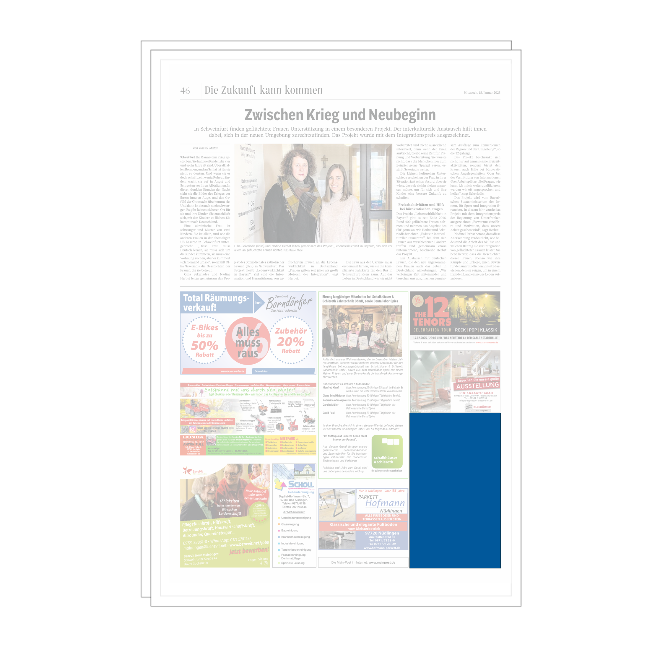 Mit einer Reichweite von über 215.000 Lesenden in Mainfranken bietet diese Sonderausgabe Ihrer Werbebotschaft einen einmaligen Rahmen. Positionieren Sie Ihr Unternehmen als verantwortungsbewussten Teil einer engagierten Gemeinschaft, und zeigen Sie Ihren Wert für die Gesellschaft. Werte wie Zuversicht, Vertrauen und Gemeinschaft stehen bei uns im Mittelpunkt, genau dort, wo auch Ihre Marke platziert werden kann.