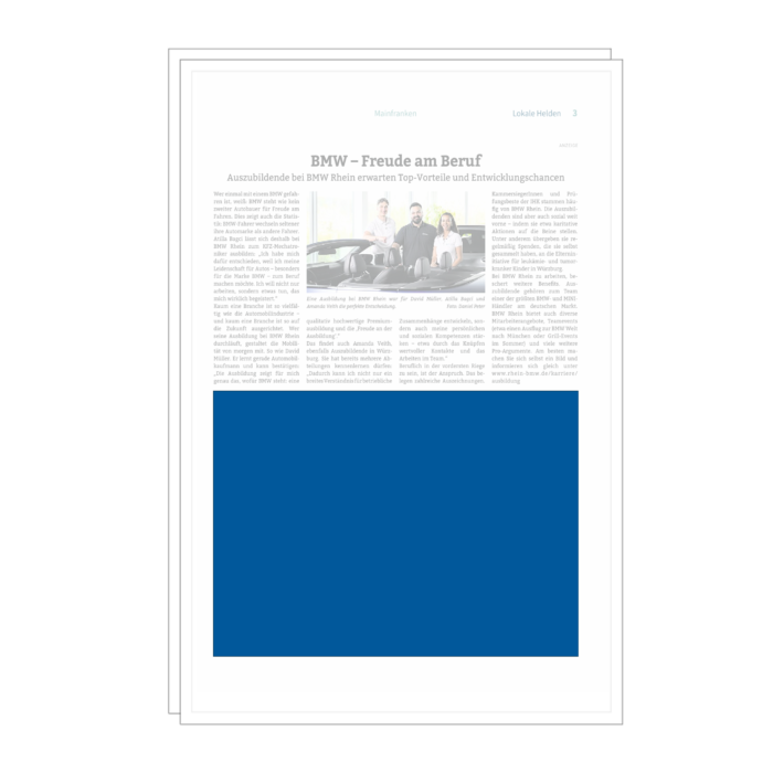 Mit der halbseitigen Anzeige in Quer- oder Hochformat platzieren Sie Ihre Botschaft im themenstarken Umfeld dieser Beilage. Präsentieren Sie Ihr Unternehmen im Kontext von Qualität, Innovation und Nachhaltigkeit und sichern Sie sich Ihren Werbeplatz.
